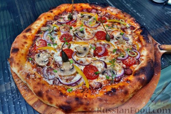 При разрезании томатный соус держится на тесте, а сыр красиво тянется за кусочком. Мясистые креветки придают пицце оригинальный вкус и яркий внешний вид, а каперсы добавляют пикантность и лёгкую кислинку.